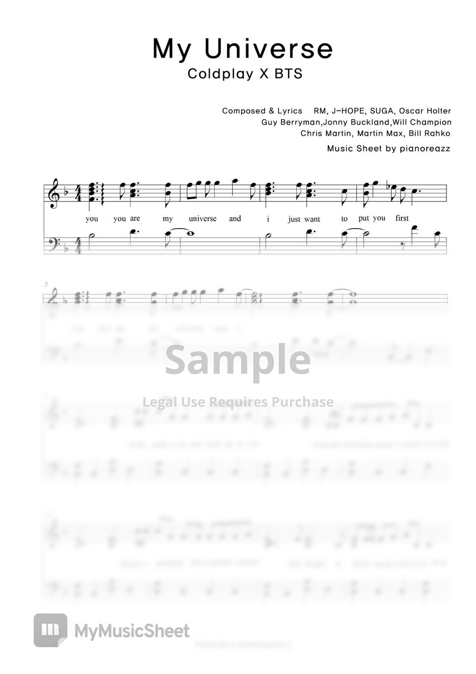 Coldplay & BTS My Universe (easy Key+Lyrics) Sheets by pianoreazz